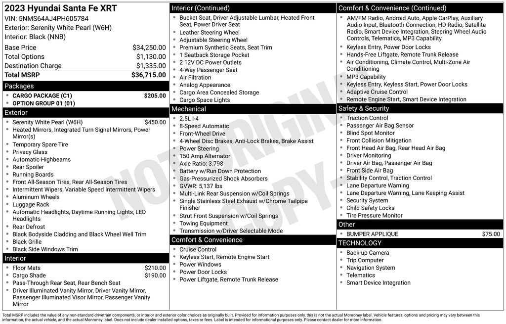 Carpeted Floor Mats, Delay-off headlights, Driver door bin, Driver vanity mirror, Dual front impact airbags, Dual front side impact airbags, Electronic Stability Control, Emergency communication system, Exterior Parking Camera Rear, First Aid Kit, Four wheel independent suspension, Front anti-roll bar, Front Bucket Seats, Front Center Armrest, Front dual zone A/C, Front reading lights, Fully automatic headlights, H-Tex Leatherette Seat Trim, Heated door mirrors, Heated Front Bucket Seats, Heated front seats, Illuminated entry, Leather steering wheel, Low tire pressure warning, Occupant sensing airbag, Option Group 01, Outside temperature display, Overhead airbag, Overhead console, Panic alarm, Passenger door bin, Passenger vanity mirror, Power door mirrors, Power driver seat, Power steering, Power windows, Radio: AM/FM Display Audio, Rear anti-roll bar, Rear seat center armrest, Rear window defroster, Rear window wiper, Remote keyless entry, Roof rack, Security system, Speed control, Speed-sensing steering, Split folding rear seat, Spoiler, Steering wheel mounted audio controls, Tachometer, Telescoping steering wheel, Tilt steering wheel, Traction control, Trip computer, Turn signal indicator mirrors, Variably intermittent wipers, Wheels: 18" x 7.5J Two-Tone Dark Alloy, Black w/Leather Seat Trim, Apple CarPlay & Android Auto, Navigation System, Power Liftgate.