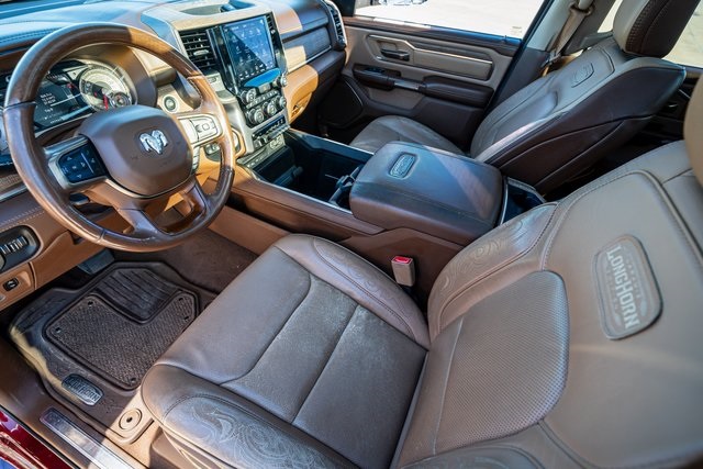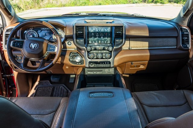 SOUTHWESTERN STYLE, UNIVERSAL APPEAL. Laramie Longhorn is luxury personified, with a hand-crafted dashboard, leather-trimmed door-panel inserts and full-leather seating. To that, add awesome forces of naturelike real barn wood accents and solid-wood tandem doors on the center console. The available Laramie Longhorn Level I Equipment Group adds power running boards, a wireless charging pad, 12-inch Uconnect touchscreen, Blind Spot Monitoring with Rear Cross-Path Detection and the premium Harman Kardon Surround Sound system
