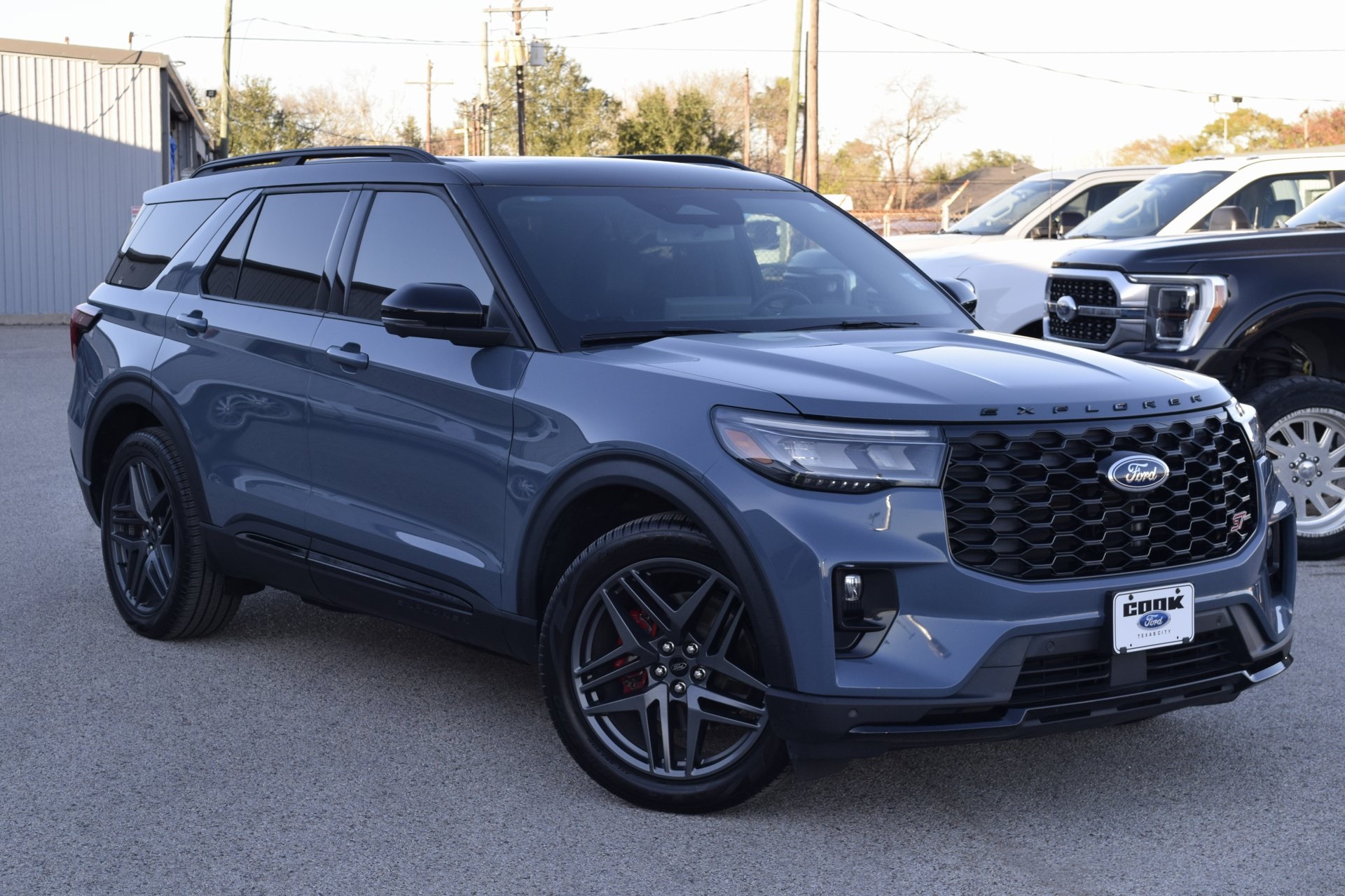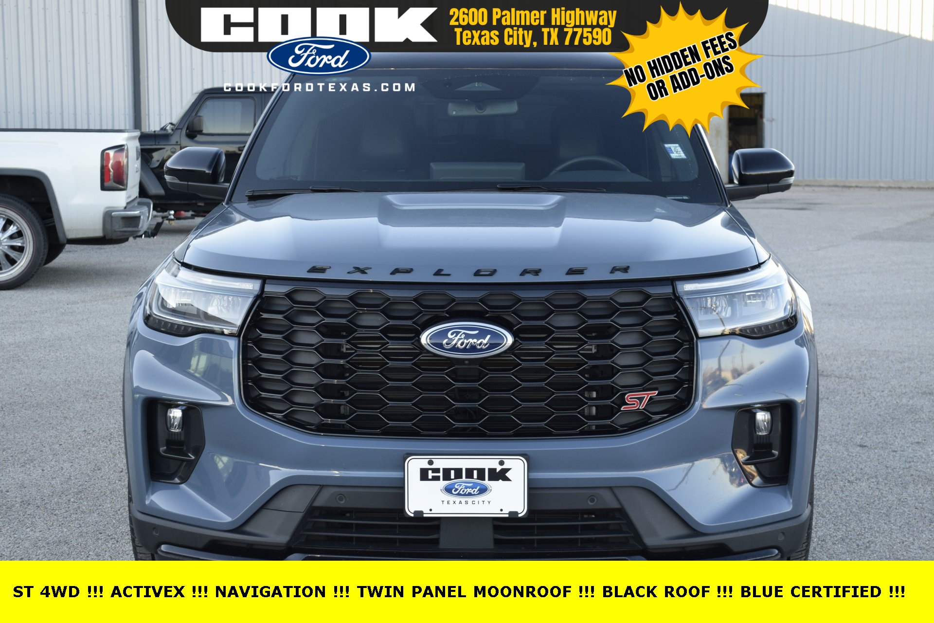 Certified. Vapor Blue 2025 Ford Explorer ST 4WD 10-Speed Automatic 3.0L EcoBoost V6 Black Painted Roof, Equipment Group 400A Standard Package, Navigation System, Power Liftgate, Wheels: 21" Magnetite-Painted Aluminum.